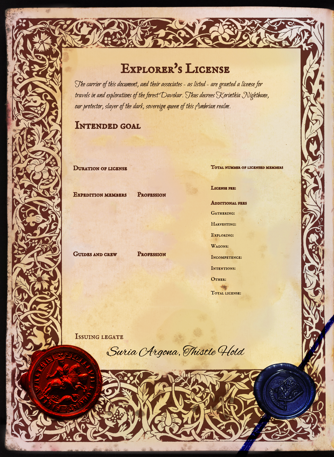 I'm quite fascinated with bureaucracy, especially bureaucracy that allows for totally arbitrary decisions by the powers that be. The Explorer's License is a perfect example of this. On paper it looks to be a simple fee structure to limit the amount of wear and tear on the forest from wagons, woodcutting, and harvesting. In reality it's a way for the Queen's Legation to evaluate who's too incompetent to go into the forest (and thus needs to pre-pay their rescue, funeral, and diplomatic incident expenses), and who's too capable to let go without wringing them for extra payments.