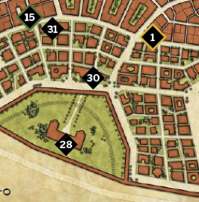 The Queen’s Legation is housed in a grand two story building right outside the gates of Nighthome. The western wing includes lodgings and on the second floor is a majestic hall where the father of the Legate tends to hold court, surrounded by town dignitaries or visiting nobles. The building’s core and southern wing hold its public spaces with reception, offices, meeting rooms and an archive. The latter is placed furthest south, on the ground floor and down in the basement.