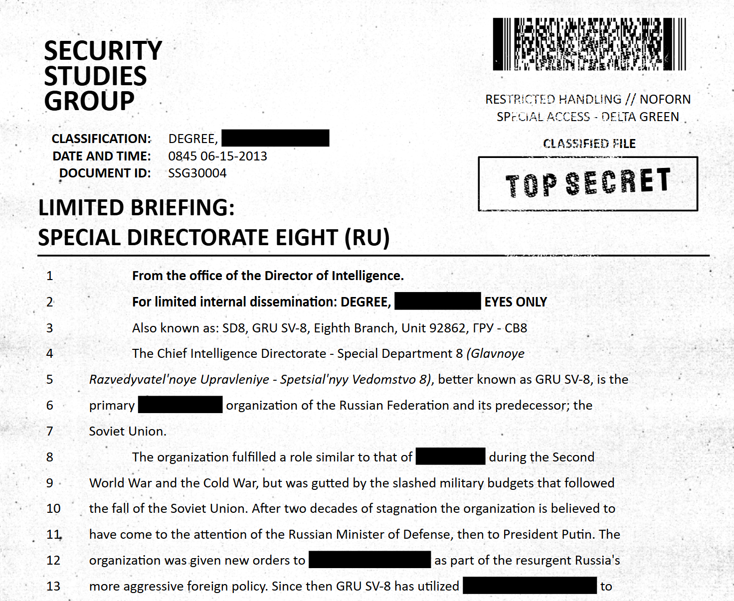 This is a significantly more modern document which I shared with my players during our run of the Iconoclasts campaign for Delta Green. My players had some run-ins with Russian intelligence and this was what their handler was able to share with them about their counterparts.