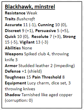 Blackhawk, minstrel: An inky black haired man with a crow beak nose, and wrapped in foppish, dog-eared, attire. He is a genteel character with a love of the drink, however, the goings on in Eldun have left him disquieted. He claims to have been tutored by the elves of Ylhurandy, regardless of the truth, Blackhawk is well educated in the myths and legends of the area. Blackhawk can tell the players about Myths: 1, 2, 3; Truths 5 (see the Tiarna side bar). If Blackhawk offers to hire the player characters, he introduces them to Tulyela, who he desires for them to save. He cannot offer money but he can assist in another way. Blackhawk can help the characters acquire something they dearly desire (eg. a Licences or the location of a mystic artifact). The details are up to the DM.