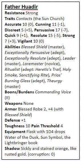 Father Huadir: An aged man with snowy white hair and deep wrinkles entrenching his face. Father Huadir fervently believes that he is doing Prios' will in burning the witches of Eldun. He believes Prios is punishing Eldun's impure faith and that the deaths of these witches will appease him. The recent attacks have stoked Eldun's fear and outrage to the point that its people believe in Huadir's murderous sermons. Father Huadir may choose to hire the player characters if he believes they are loyal to the church. The church's coffers have been deeply filled as worshipers attempt to buy Prios' mercy. He can offer them a purse of 1000 Thaler in exchange for their aide hunting down the witches of Eldun. Father Huadir is woefully uniformed about the Tiarna, but, there are some clues in the church's vaults. There are Myths: 3 and 4 and Truths: 3. A full day of searching through the vaults discovers an ancient map marking the Tiarna court. An [Accurate] test can plot the location on a modern map. Failure adds 2 days to the journey. The court is otherwise less than a day's travel away.