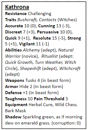 Kathrona: A middle aged woman with grey in her long auburn braid and yearling wrinkles about her bright hazel eyes. Kathrona is a witch whose here to investigate the Tiarna's more violent behaviour as of late. She works as a scullery maid, cleaning the church of Prios, believing she could take a look at the church's vault where she thinks there is a map to the Tiarna court. Kathrona knows more about the Tiarna than anyone else in town and might be willing to inform the player characters of the all the Truths of the Tiarna. If Kathrona can be convinced to trust the players, she hires them to assist her settle the Tiarna and deal with the murderous priest, Father Huadir. Kathrona knows of a forgotten supply cache of the Iron Pact as a means of payment.
